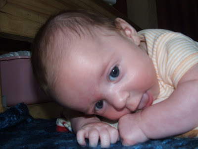 Ben was happily having awake time on the floor after lunch today when all of the sudden he began to fuss. I know this fuss very well, it's his "I'm tired, please put me to bed" fuss. However, I was busy in the kitchen and admittedly, didn't really want to stop what I was doing. A few minutes passed and his fussing only became louder. Upon the guilty realization that I was ignoring a sleepy baby, I stopped what I was doing and went into the living room to wrap him up. (The boys will only sleep tightly swaddled) I didn't realize how sleepy he was; however, until I grabbed his blanket and started to fold it in preparation to swaddle him. Well Ben was watching my every move. In fact, he even laughed and started doing his excited kicking when he saw me doing this. I no sooner scooted him onto the blanket and his eyes began to close. As I carried him to bed, he smiled semi-unconsciously the entire way. It was such a sweet moment I couldn't resist sharing it. Happy napping, Benji.